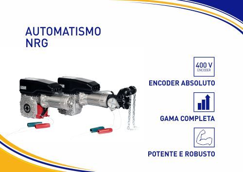 Potente, Plug & Play. Ditec NRG é a gama de automatismos irreversíveis trifásicos para portões seccionados industriais e comerciais de grandesdimensões, até 650 kg. Automatismo da Ditec de gama completa com (3) três motores de 90 Nm e um de140 Nm, versões com fins de curso mecânicos de 6 excêntricos ou encoder absoluto. Manobra manual de emergência com corrente manual ou mecanismo de desbloqueio rápido. O automatismo NRG pode ser amplamente personalizado, graças a uma vasta gama de acessórios Ditec.