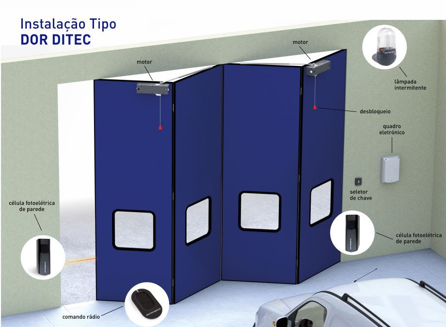 Simples e fiável. O Ditec DOR automatiza os portões de fole com recolha de duas folhas com dimensões até a 1,5 + 1,5m: fixado somente numa folha, abre e fecha mediante um simples braço telescópico. Este automatismo pode ser instalado num espaço mínimo sempre com a máxima funcionalidade. Automatismo para portões industriais de fole, permite movimentar duas folhas até 3 metros. Está equipado com um sistema de desbloqueio à distância, que permite sempre quaisquer manobras manuais em caso de emergência.